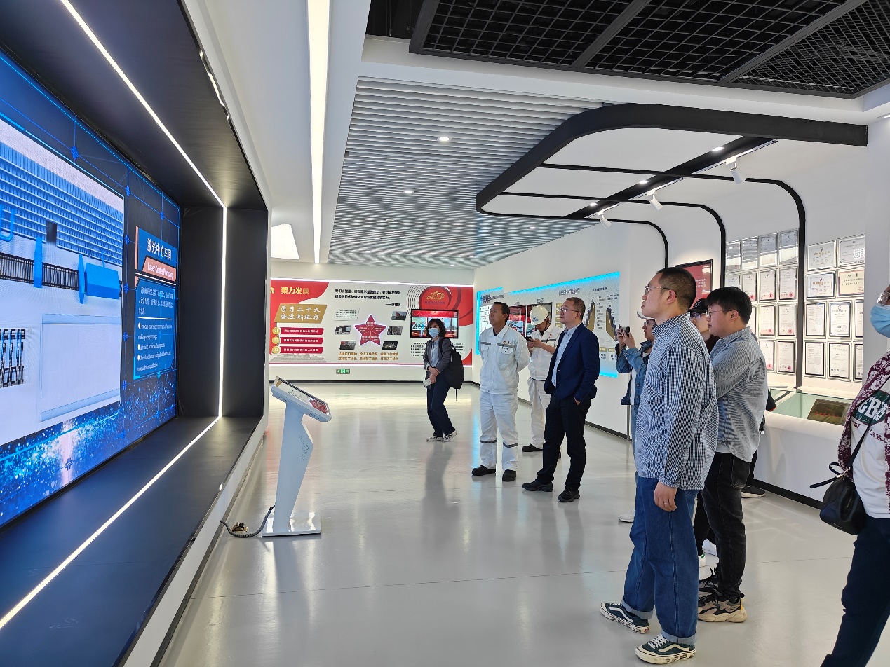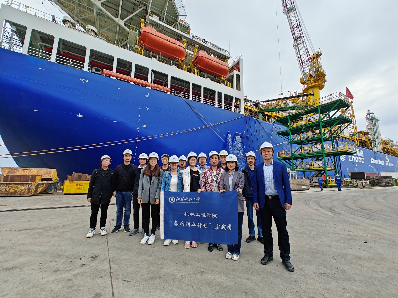 随后,招商重工董主任带队参观了招商局重工(江苏)有限公司展览馆,从整体上感受招商局重工的产品结构及布局。接下来在码头参观招商局重工生产的海洋钻井平台、货物运输船等大型在建设备,工作人员就海洋平台的升降机构、拖链、液压动力等方面进行相关讲解。针对与机械设计联系密切的船舶结构、焊装工序以及LNG储气罐结构、保温层设计结构等方面,青年博士与技术人员进行细致地探讨。