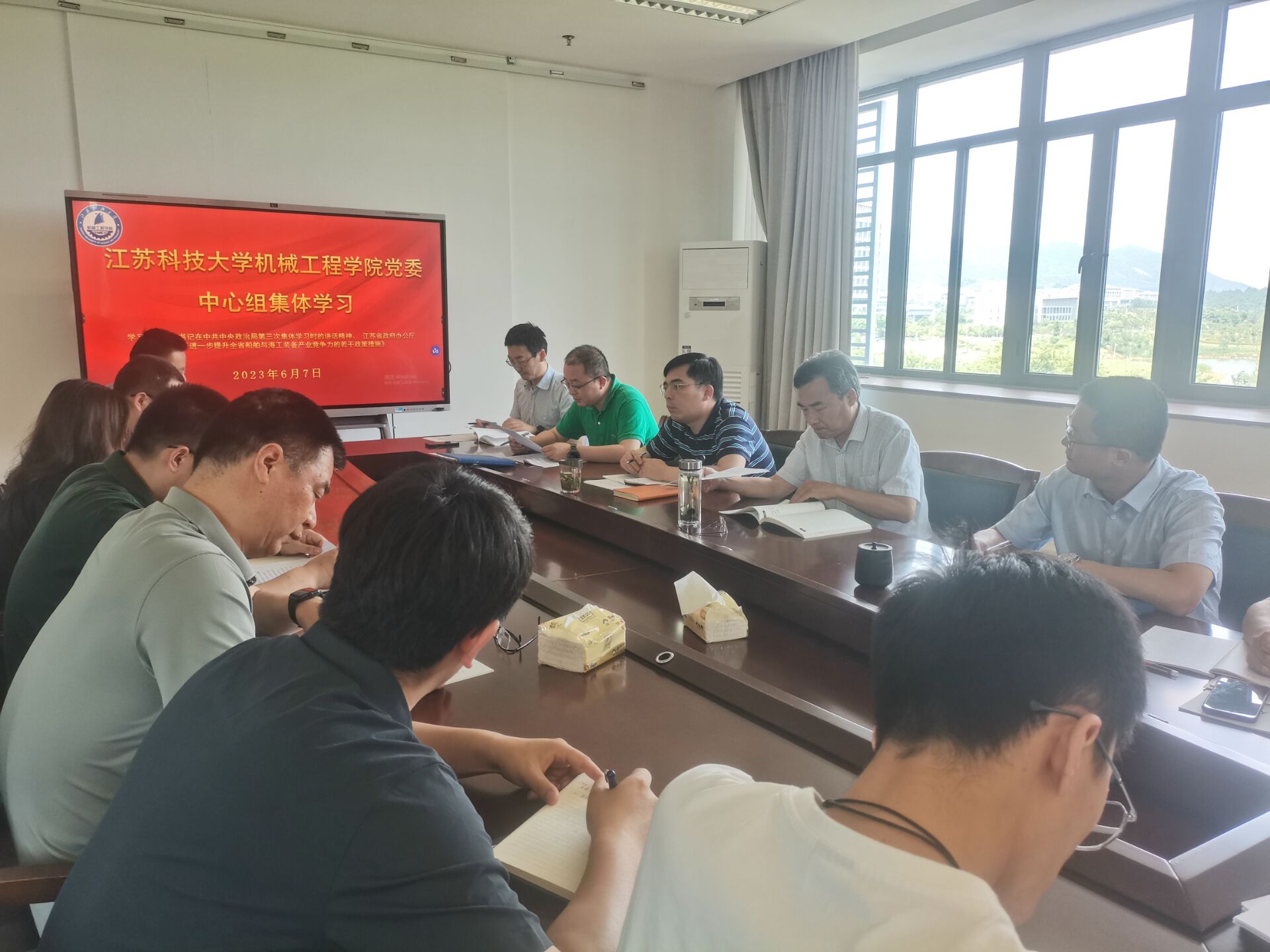 6月7日下午,按照《国产黄色视频 2023年上半年中心组学习计划》安排,机械学院党委召开党委中心组学习,学习主题为“学习习近平总书记在中共中央政治局第三次集体学习时的讲话精神、江苏省政府办公厅《关于进一步提升全省船舶与海工装备产业竞争力的若干政策措施》”。本次学习由学院党委副书记谭海波主持,院党委中心组全体成员、党支部书记参加,校党委副书记景旭文巡学旁听并给予指导。
