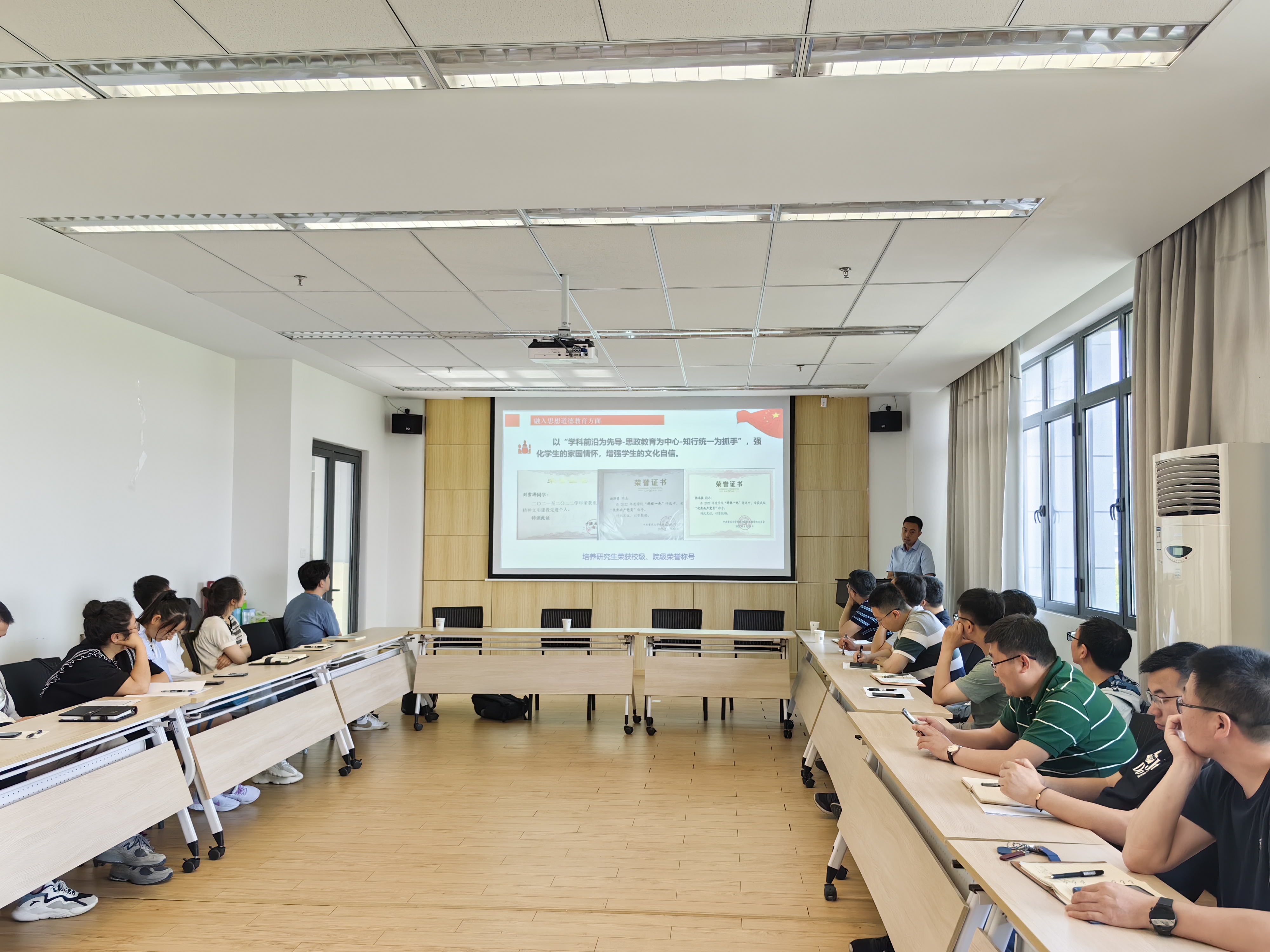 首先,肖贵坚副教授围绕“立德树人融入课程与人才培养的方法与成效研究”作了主题分享。他从党的二十大报告对青年和青年工作的重要论述讲起,强调对青年进行思想引领的重要性,接着,他详细讲解了自己将立德树人融入实践育人、课程教学的人才培养过程的做法和成效,并结合自己讲授的工程制图课程,系统介绍了融入工匠精神的工程制图产教一体化混合教学模式,分享了自己对本科生、硕士生、博士生、博士后培养的体会。