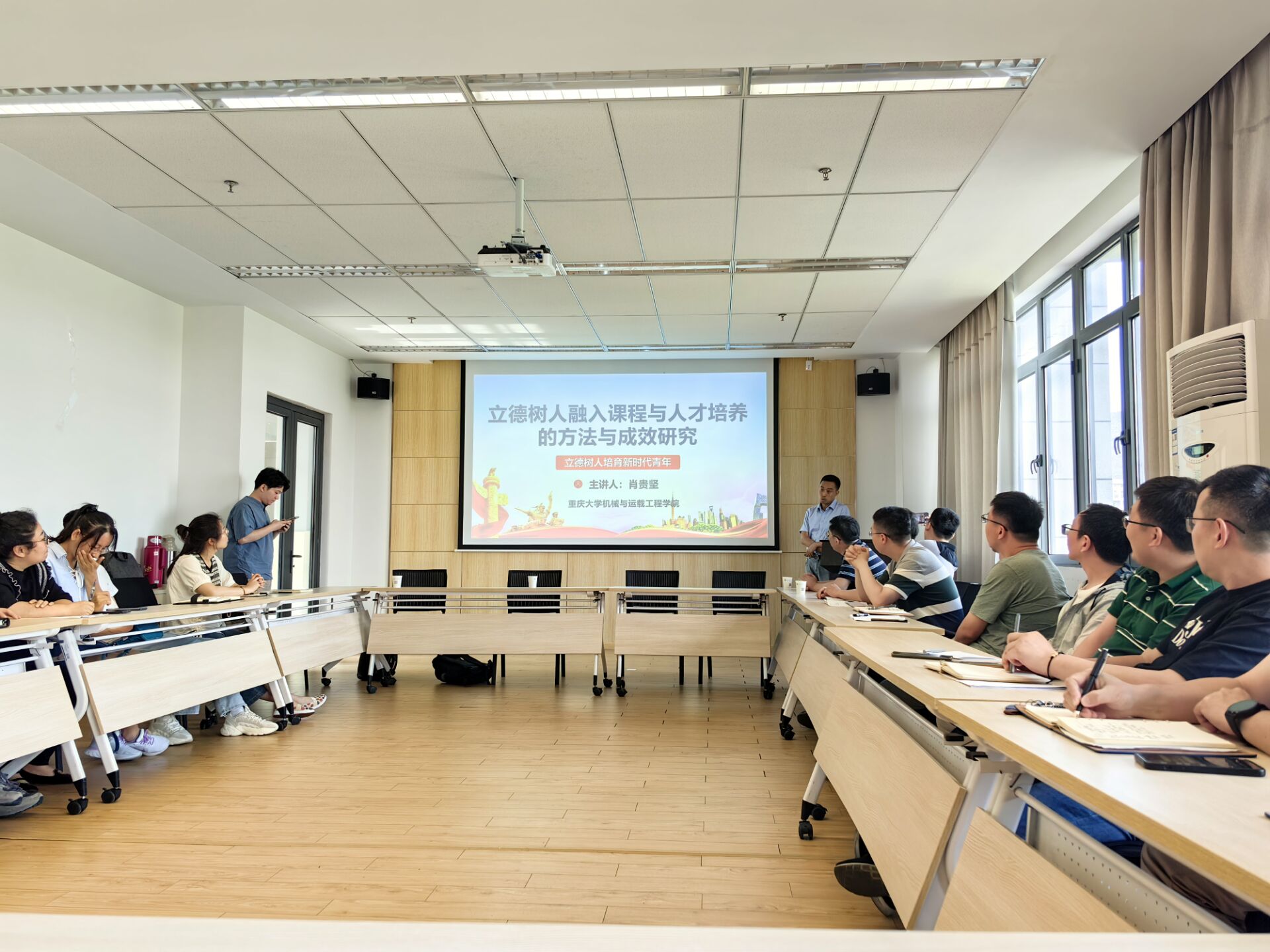 为深入推进学习贯彻习近平新时代中国特色社会主义思想主题教育,落实立德树人根本任务,持续推进“春雨润业”计划,提升教师课程思政教育教学水平,6月13日下午,国产黄色视频 在机械楼445召开“教学方法与课程思政”交流研讨会,2008届校友、重庆大学机械与运载工程学院副教授、博士生导师肖贵坚应邀出席并做主题分享,学院党委书记翟纯纯、副院长钟伟及学院青年教师、研究生辅导员共同参与交流,研讨会由副院长钟伟主持。