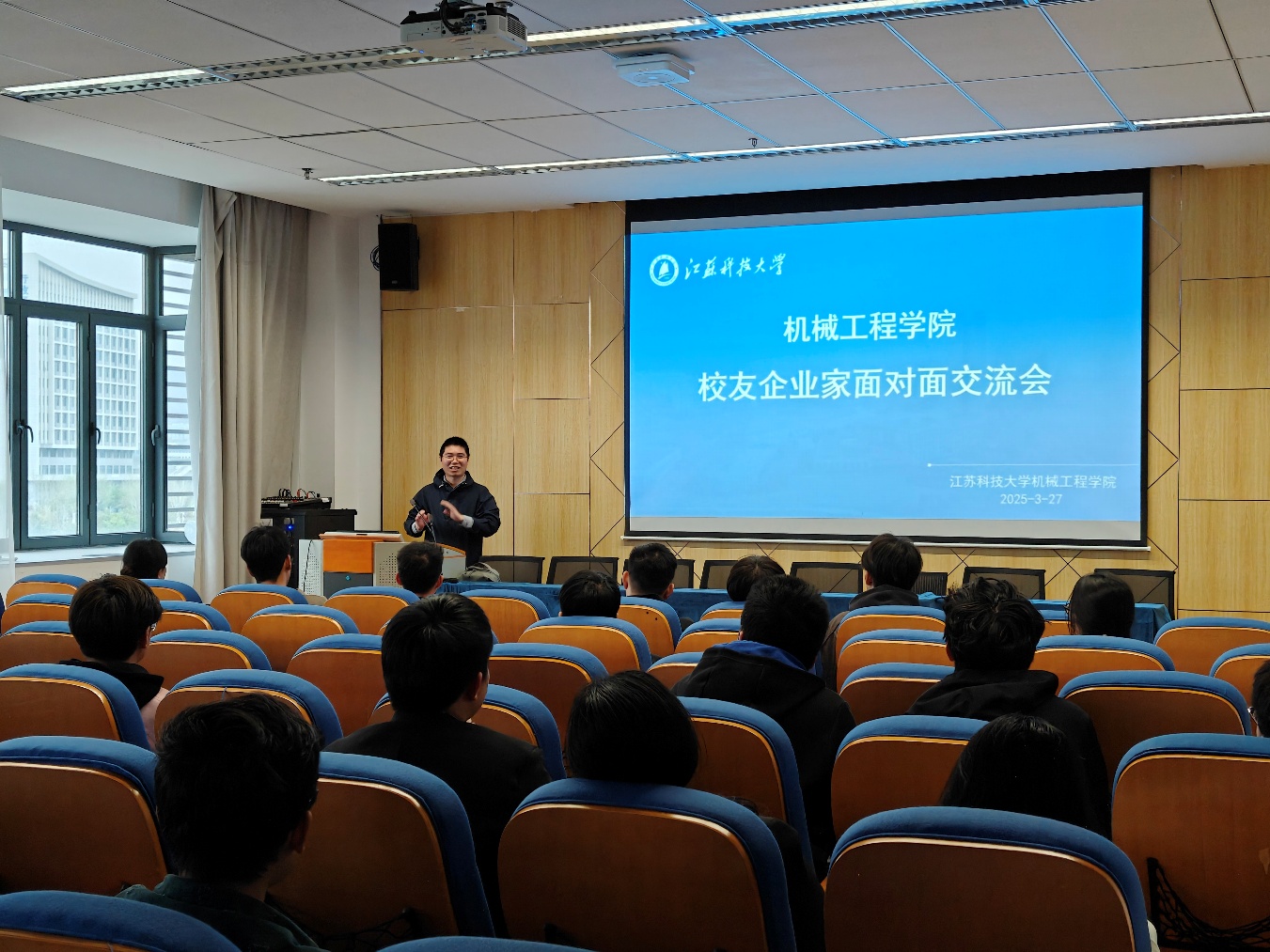 交流会上,任云谦总经理以“从校园到社会:以奋斗书写职业人生”为主题,向同学们分享了自己在校求学的宝贵经历以及毕业后创业的艰辛历程。他结合实际案例,深入浅出地剖析了技术攻关中理论与实践脱节的挑战、海外业务拓展中的文化差异等问题,勉励同学们在校期间珍惜学习机会,扎实掌握专业知识,培养解决实际问题的能力。任云谦强调,当前国际形势复杂多变,全球科技竞争日益激烈,青年一代既面临前所未有的挑战,也拥有无限的发展机遇。他特别提到,深度学习、人工智能等新兴技术在工业领域的广泛应用,为机械工程专业学生提供了广阔的创新空间。他希望同学们以机械学科为基础,积极交叉融合电气、计算机等多学科知识,勇立科技潮头,在未来的职业发展中展现江科大学子的担当与风采。