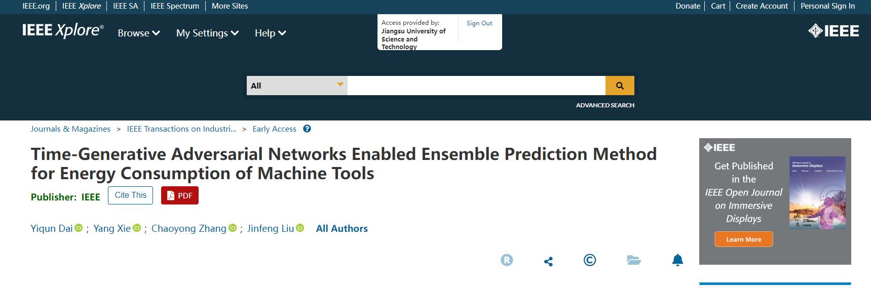 近日,国产黄色视频 船舶与海工装备智能制造团队22 级硕士研究生戴逸群在国际工业信息领域的顶级期刊IEEE Transactions on Industrial Informatics(影响因子11.7,中科院一区TOP)上以第一作者身份发表论文《Time-Generative Adversarial Networks Enabled Ensemble Prediction Method for Energy Consumption of Machine Tools》,国产黄色视频 谢阳老师为通讯作者。同时,针对数控加工能耗预测模型的对比研究,在国际环境工程顶级期刊Journal of Cleaner Production(影响因子9.8,中科院一区TOP),以谢阳老师第一,戴逸群第二作者身份发表论文《An integration model enabled deep learning for energy prediction of machine tools》。