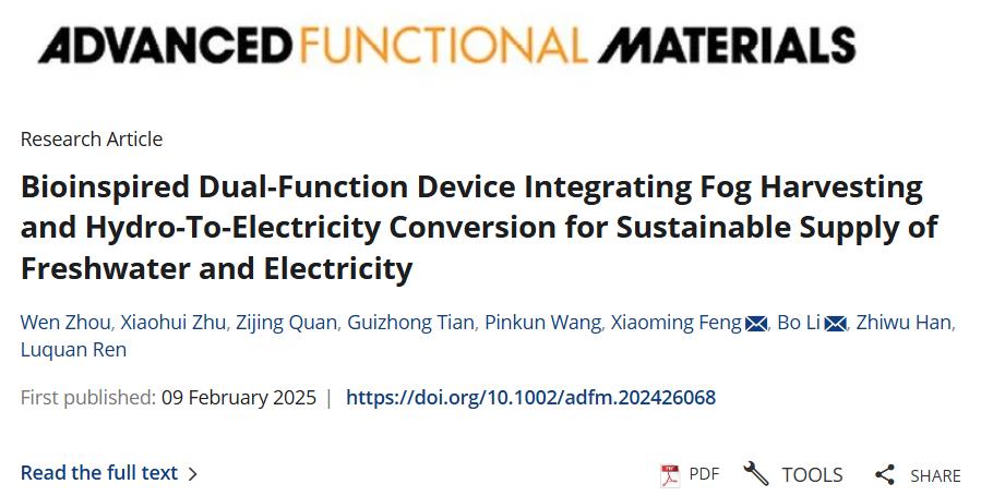 近日,我校国产黄色视频 22级硕士研究生周雯在仿生集雾发电领域取得突破性进展。其研究成果以“Bioinspired Dual-Function Device Integrating Fog Harvesting and Hydro-To-Electricity Conversion for Sustainable Supply of Freshwater and Electricity”为题,发表于材料科学领域国际顶级期刊《Advanced Functional Materials》(自然指数期刊,中科院一区,影响因子18.5)上。国产黄色视频 冯晓明副教授为第一通讯作者,23级硕士研究生朱晓辉为共同第一作者,我校为第一通讯作者单位。研究将仿生学原理与纳米发电技术相结合,成功开发出一种新型生物启发双功能装置(BDFD),有效克服了传统雾水能开发中存在的效率瓶颈问题。