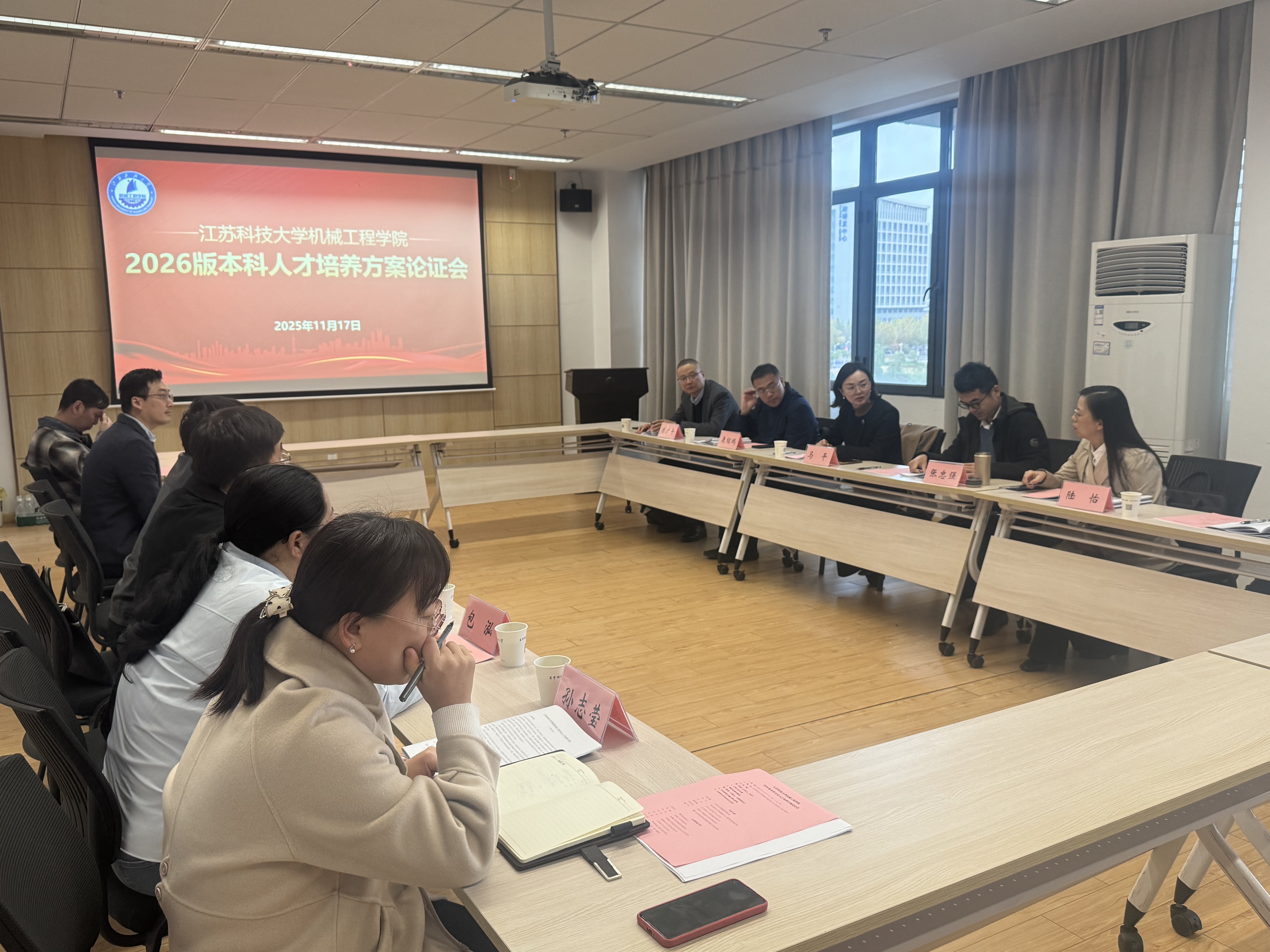 为进一步提升培养方案的科学性、前瞻性与可行性,提升人才培养质量,学院于11月17日召开2026版本科专业人才培养方案论证会。会议邀请江苏大学张忠强教授,南京林业大学马平教授,常州大学陆怡教授,江苏理工学院康绍鹏教授,淮阴工学院张光祥教授以及镇江中船现代发电设备有限公司陈广平高级工程师参与评审论证,教务处副处长田桂中、学院院长张建、副院长钟伟、专业负责人、系主任、骨干教师代表出席会议。